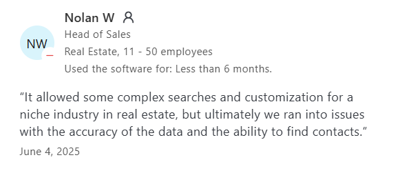 The most common complaints about ZoomInfo are data inaccuracy, pricing concerns, and customer service issues. Users have experienced problems with outdated or incorrect contact information, which makes it difficult to find accurate contacts, especially for niche industries like real estate.