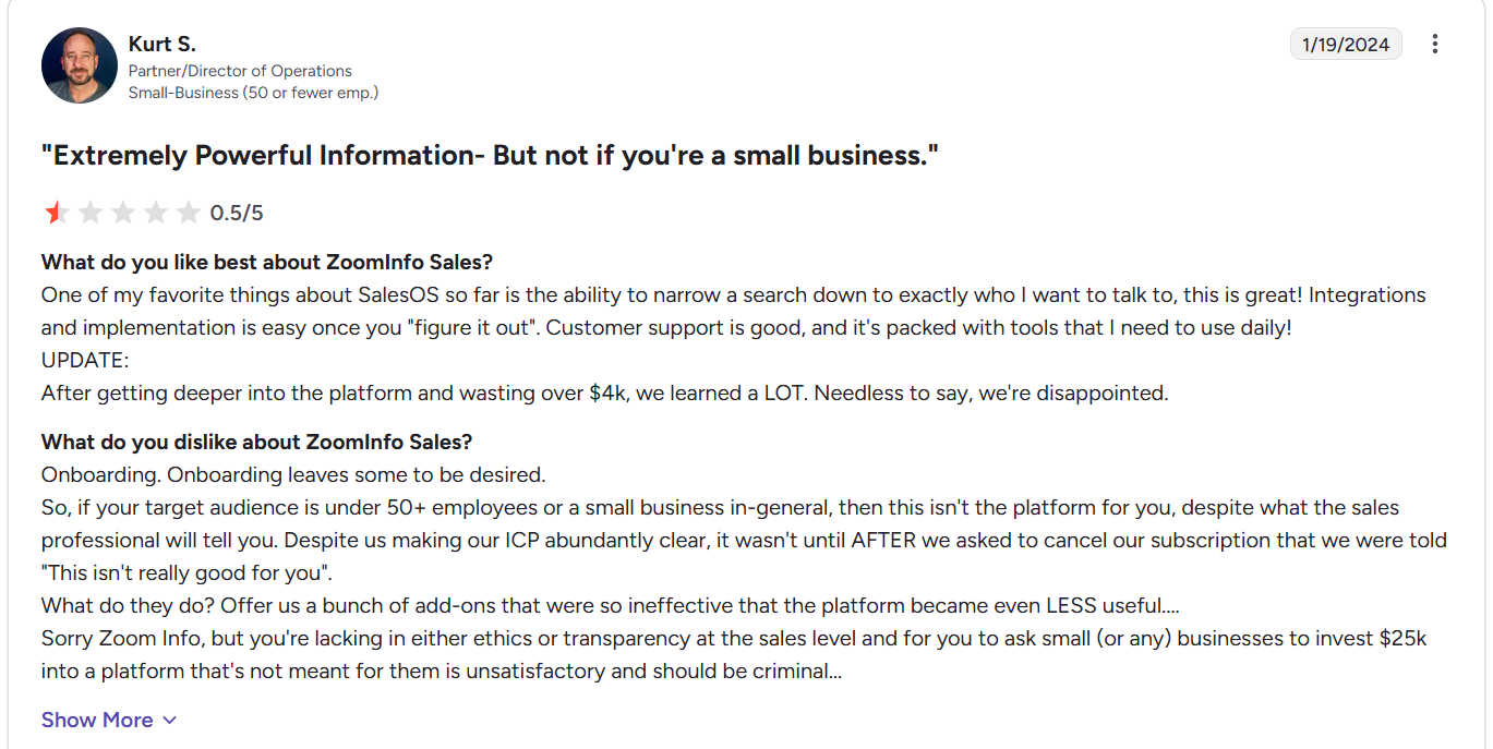 Several small businesses have concerns that ZoomInfo does not help them target their ICP (Ideal Customer Profile). ZoomInfo users report contract terms with long durations, auto-renewal clauses, and difficulties in cancelling subscriptions.